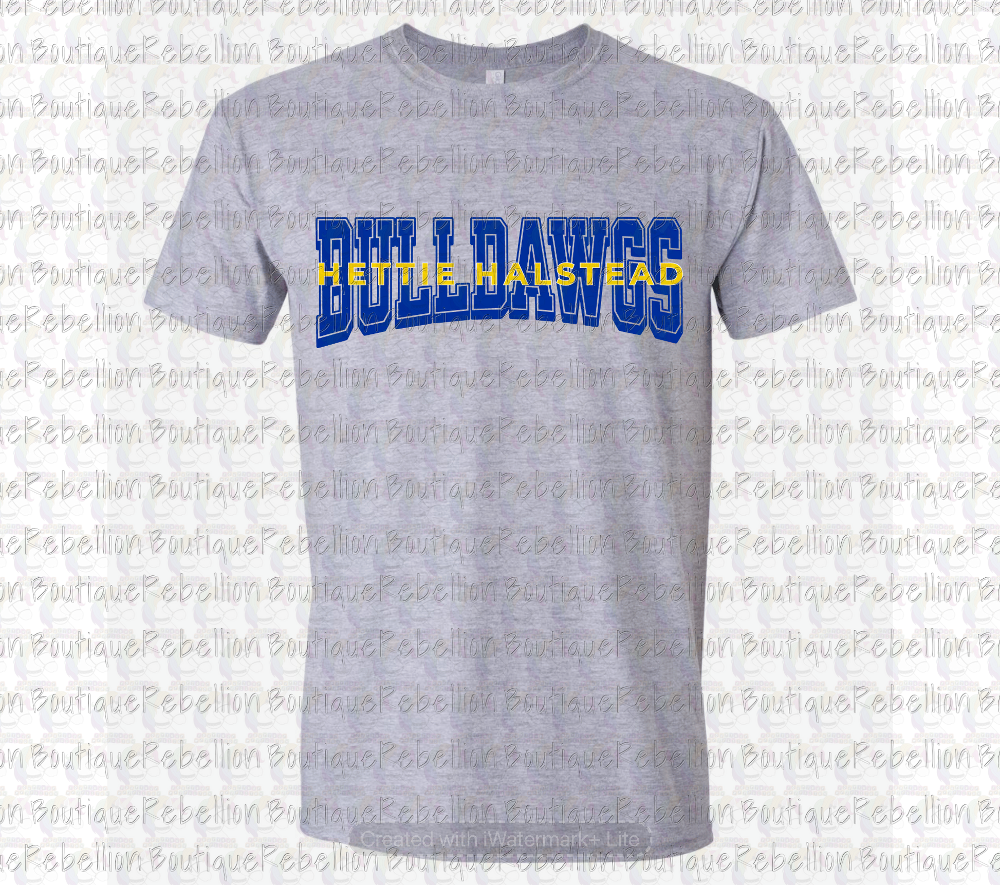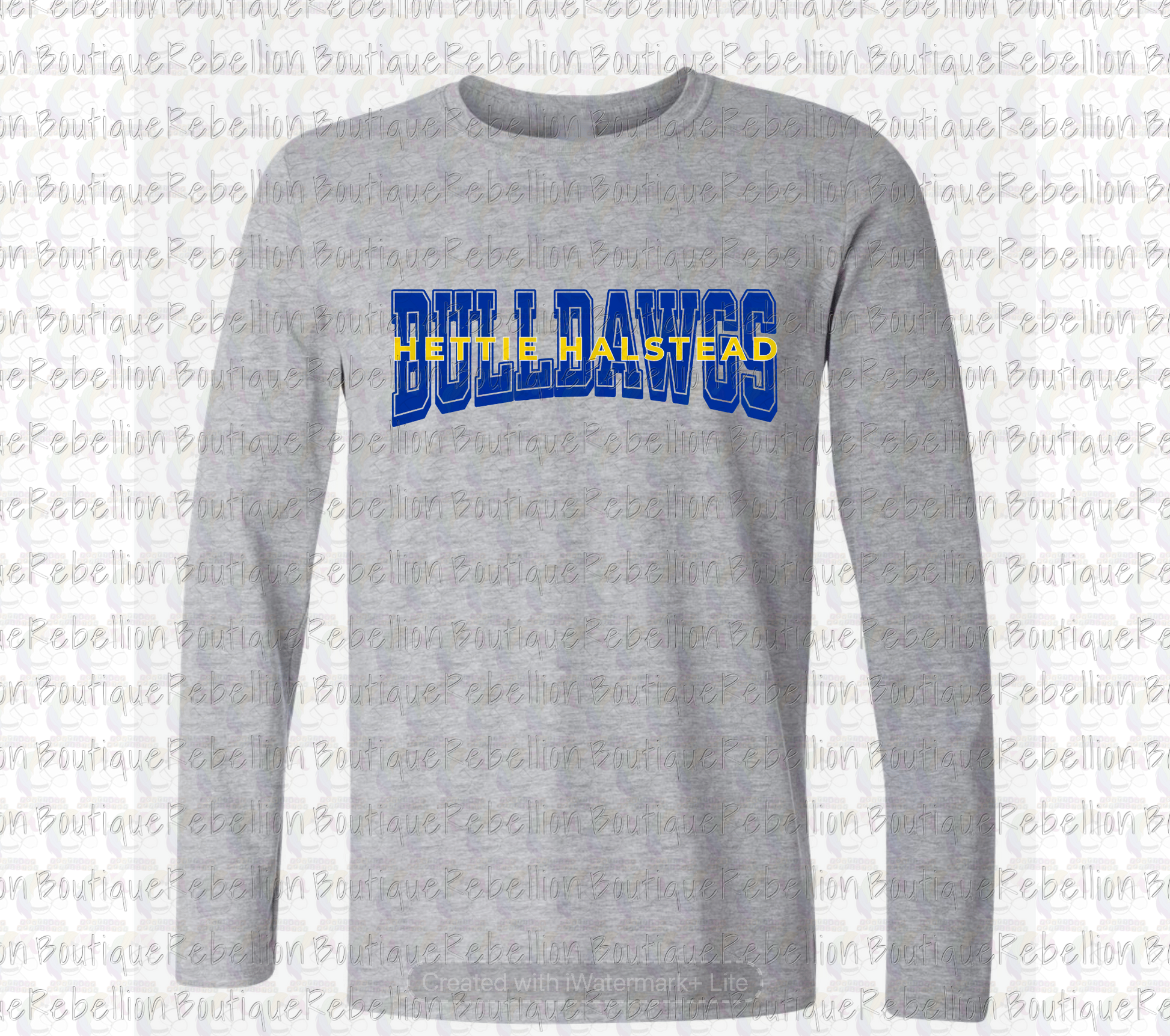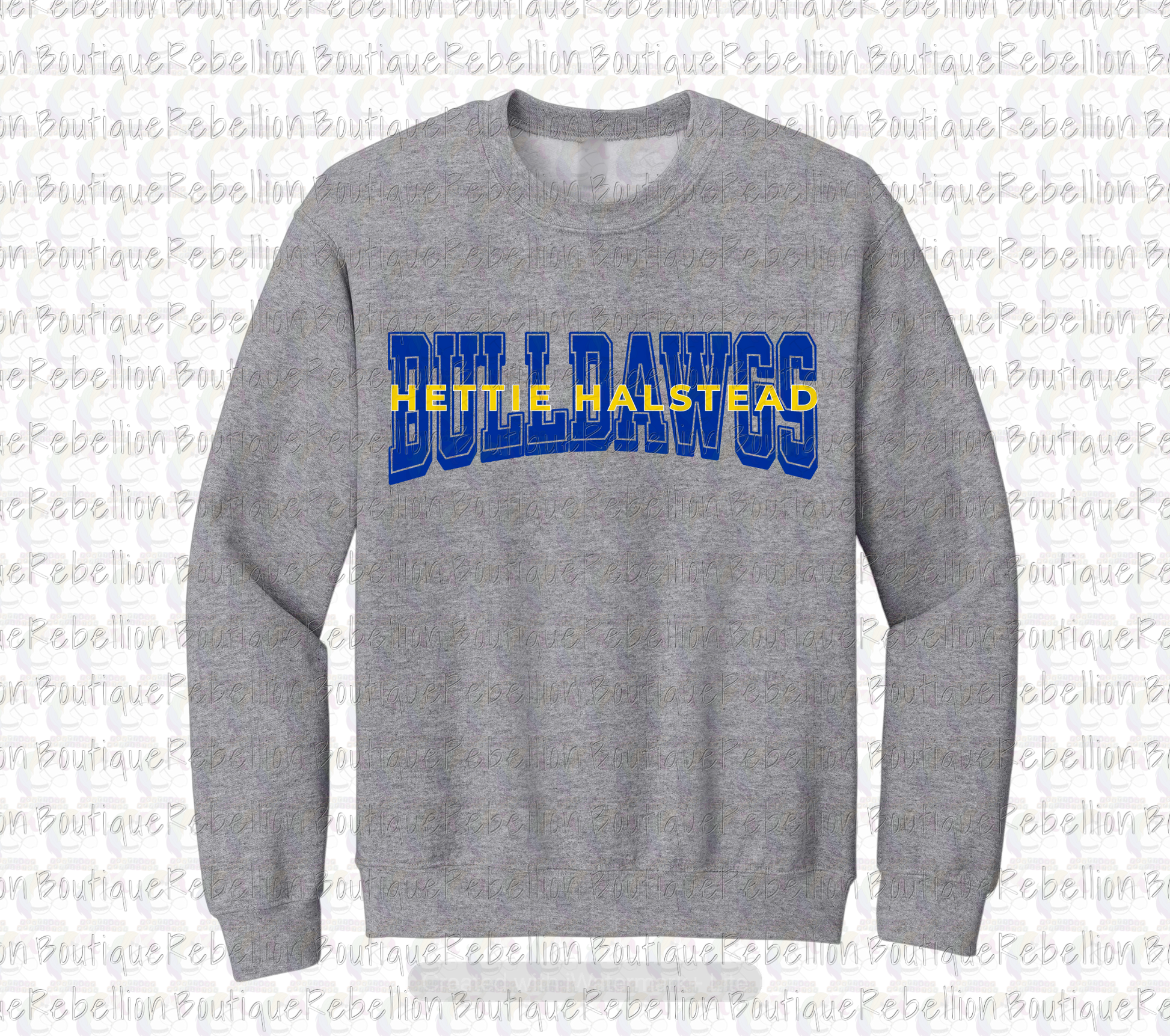 Hettie Halstead Elementary Bulldawgs Text Crewneck Sweatshirt, Long Sleeve or Short Sleeve Adult Tee or Youth Tee