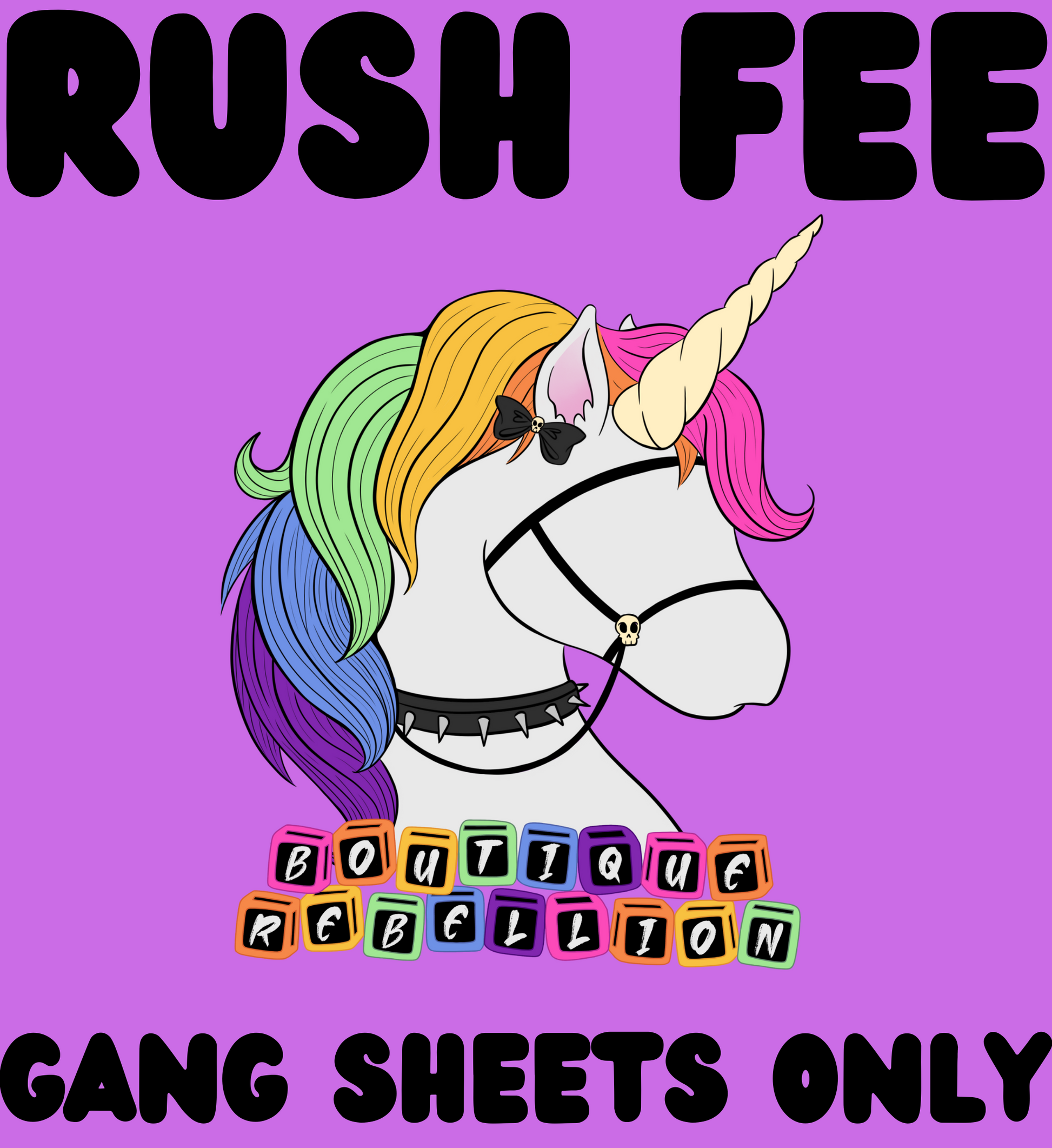 - All sheets must be in the same order as the RUSH fee. If there is more than one order placed, the initial $25 fee will be charged per order and then each additional sheet in each order will incur the $10 charge. Any additional RUSH fees that were not paid will be invoiced & TAT will begin once they are paid and all gang sheets received, THIS MAY AFFECT YOUR TAT.